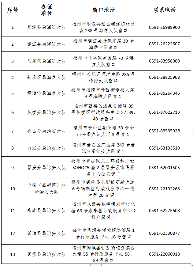 福州市公安局邊境管理區(qū)通行證辦證窗口設(shè)置一覽表
