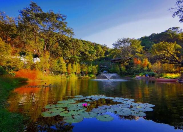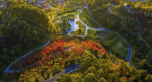園內(nèi)成片的楓葉已換上紅妝,色彩斑斕的楓林描繪出如詩如畫的意境。
