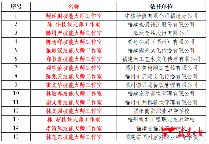 臺海網(wǎng)12月9日訊 據(jù)福建日報·新福建APP報道 近日,福州市人社局、福州市財政局聯(lián)合公布2020年市級技能大師工作室名單,師延財技能大師工作室等15個工作室入選。據(jù)悉,每個市級技能大師工作室將獲得補助經(jīng)費5萬元。