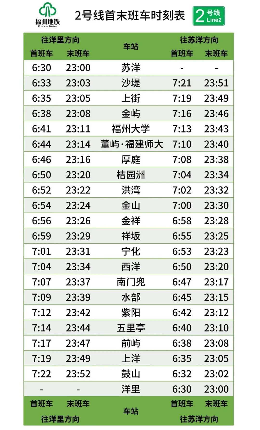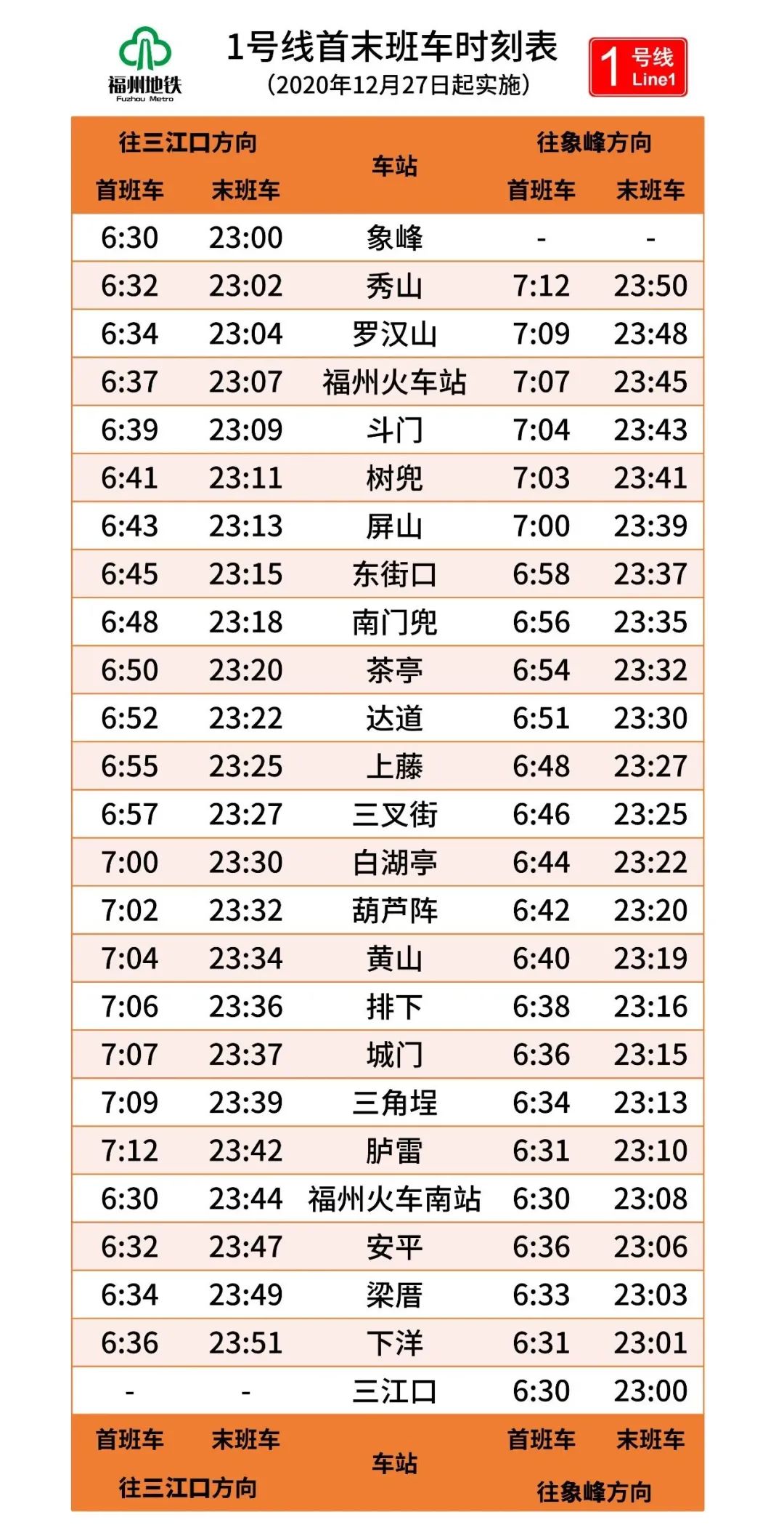 為了保障市民早間出行需求,1號(hào)線首班車于6:30分別從三江口站、福州火車南站及象峰站始發(fā),末班車于23:00分別從三江口站、象峰站始發(fā)。各站首末班車時(shí)間如下: