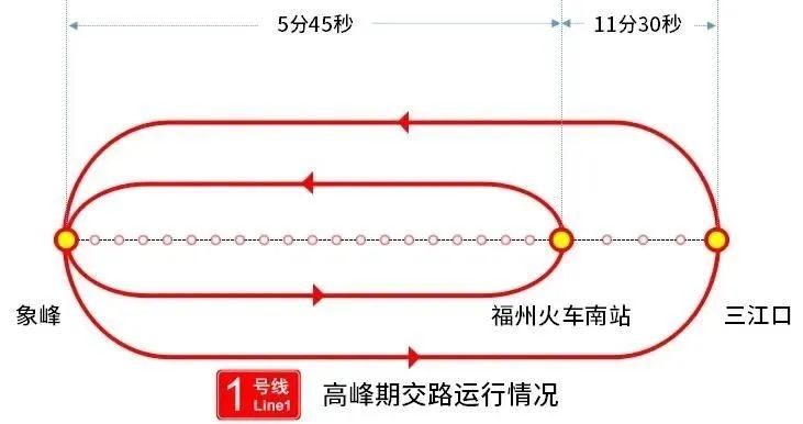 開(kāi)通初期,工作日高峰時(shí)段,象峰至福州火車南站,行車間隔為5分45秒;福州火車南站至三江口,行車間隔為11分30秒。
