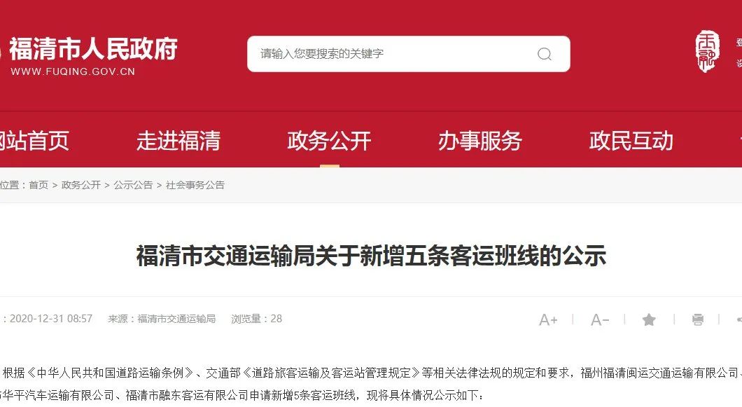 臺海網(wǎng)1月5日訊 據(jù)福清市人民政府網(wǎng)發(fā)布 近日,福清市交通運(yùn)輸局發(fā)布《關(guān)于新增五條客運(yùn)班線的公示》福州福清閩運(yùn)交通運(yùn)輸有限公司、福清市華平汽車運(yùn)輸有限公司、福清市融東客運(yùn)有限公司申請新增5條客運(yùn)班線。