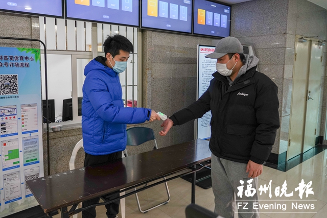 省體育中心內(nèi),工作人員為市民測量體溫。