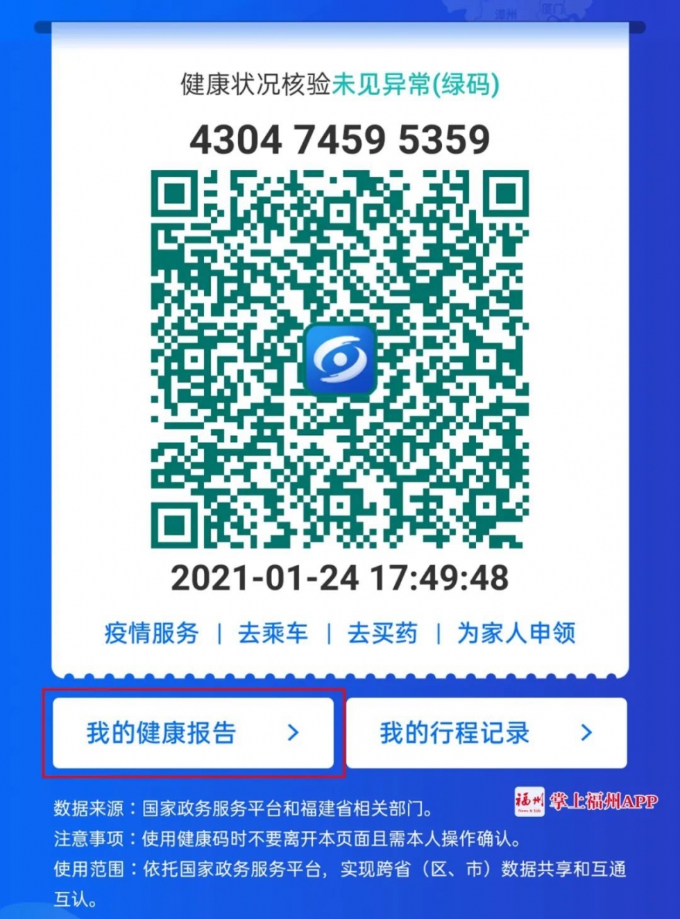 檢測結果除了以上兩個渠道可查詢外,還可通過“閩政通”APP中的“八閩健康碼”查詢。