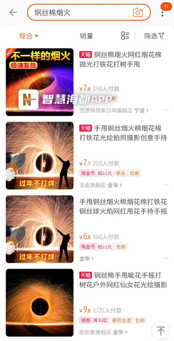 福州市場(chǎng)少見“鋼絲棉焰火”產(chǎn)品,但記者在各大電商平臺(tái)瀏覽發(fā)現(xiàn),在不少售賣“鋼絲棉焰火”的網(wǎng)店平臺(tái)首頁(yè)中,紛紛打出“燃放效果如煙花”“讓你瞬間變網(wǎng)紅”的宣傳標(biāo)語(yǔ)吸引顧客的目光。在一家發(fā)貨地為浙江金華的淘寶店中,鋼絲棉的價(jià)格從22元到100多元不等,月銷量達(dá)1萬(wàn)余,店家稱購(gòu)買者多為年輕人。