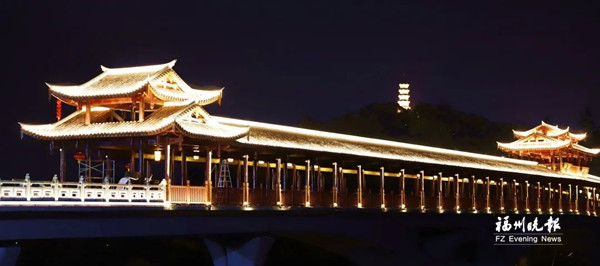 該橋安裝了燈光亮化工程,41盞仿古吊燈把橋裝點(diǎn)得分外靈動(dòng)、秀媚,在夜色中成為一道亮麗的風(fēng)景線。(來源:福州晚報(bào))