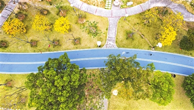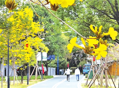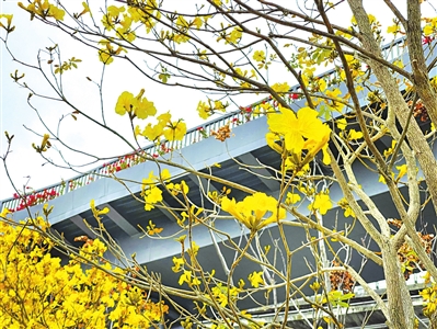 25日上午,在橋梁園靠近尤溪洲大橋北橋頭的公園步道旁,十余株黃花風(fēng)鈴木開得正旺。其中有六株已經(jīng)掛滿了金色的花朵,和公園新修的藍(lán)色步道形成絕佳的配色。