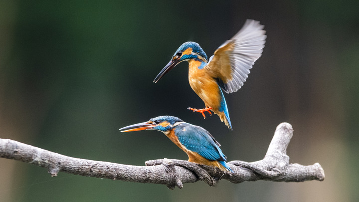 3月22日,在福州西湖公園的荷塘一角,兩只翠鳥(niǎo)在水邊的樹(shù)枝上嬉戲。