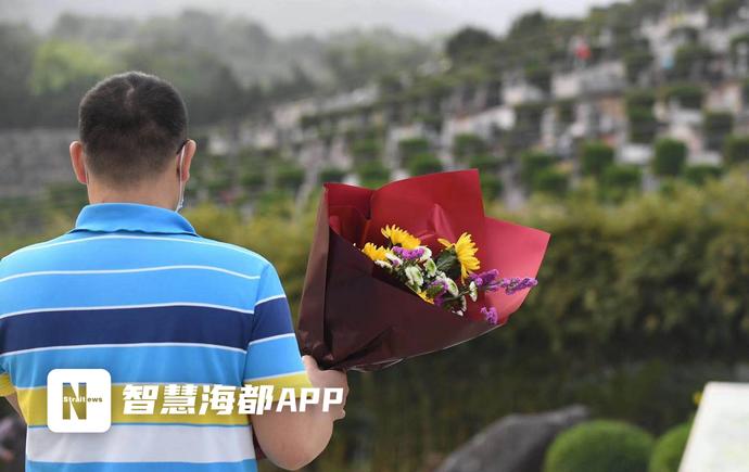 清明首日,天氣晴朗,不少市民提著鮮花和祭掃的相關物品,拉著家人一起來到陵園祭掃。