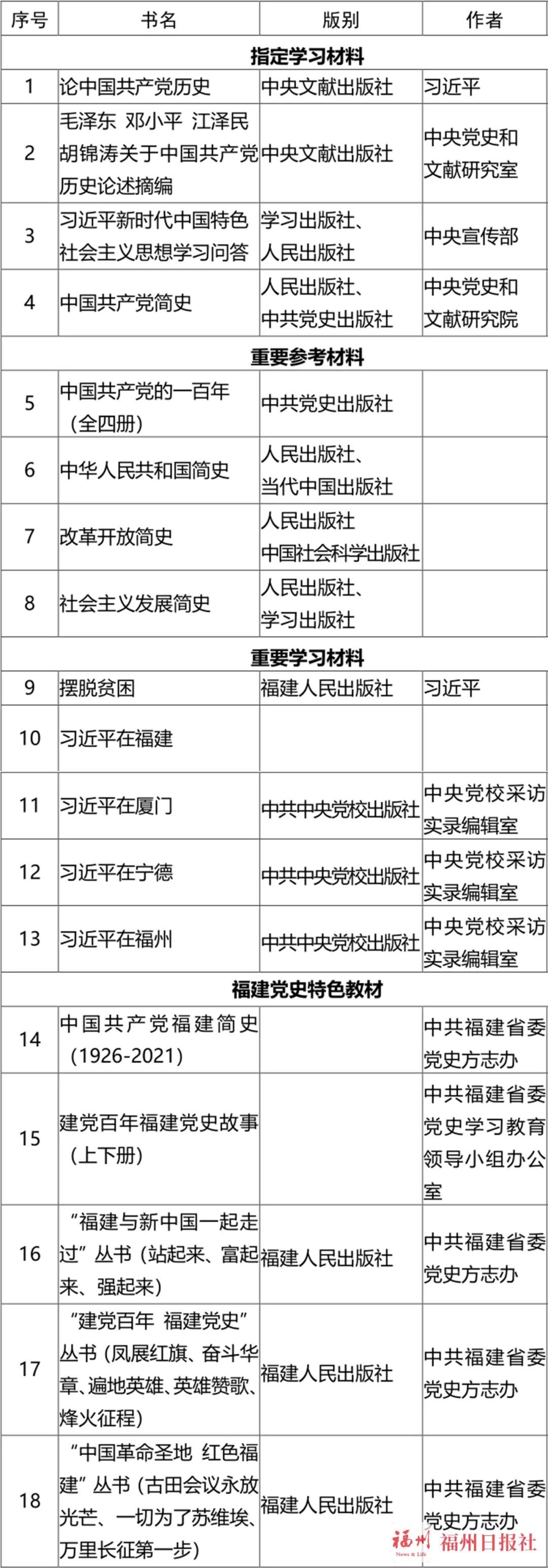為深入學(xué)習(xí)貫徹習(xí)近平總書記在黨史學(xué)習(xí)教育動(dòng)員大會(huì)上的重要講話精神,扎實(shí)開展黨史學(xué)習(xí)教育,近期,省委黨史學(xué)習(xí)教育領(lǐng)導(dǎo)小組辦公室發(fā)布黨史學(xué)習(xí)教育學(xué)習(xí)書目,包括指定學(xué)習(xí)材料、重要參考材料、重要學(xué)習(xí)材料、福建黨史特色教材等四類18種圖書,供廣大黨員干部學(xué)習(xí)使用。