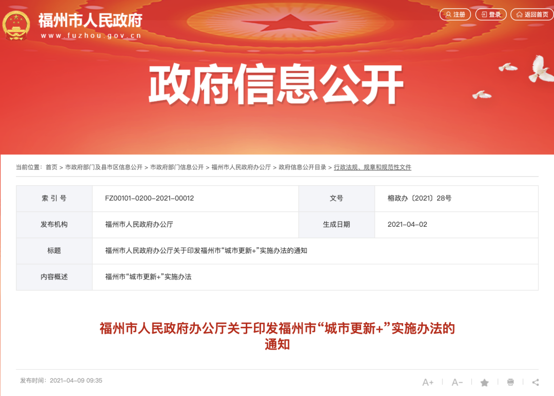 4月9日,福州市人民政府網(wǎng)站發(fā)布《福州市人民政府辦公廳關(guān)于印發(fā)福州市“城市更新+”實施辦法的通知》。