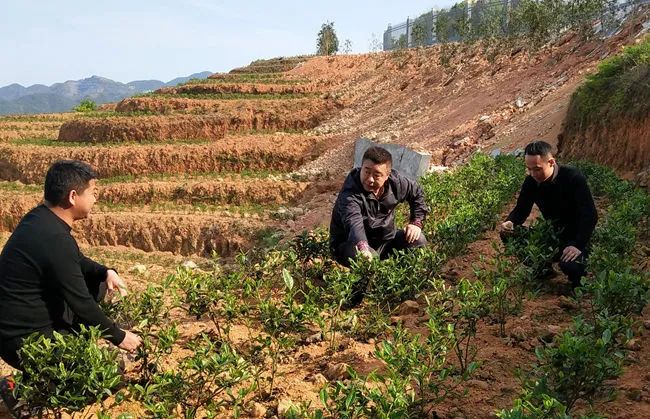 黃炎(中)察看村集體茶園茶葉長勢 肖友福 攝