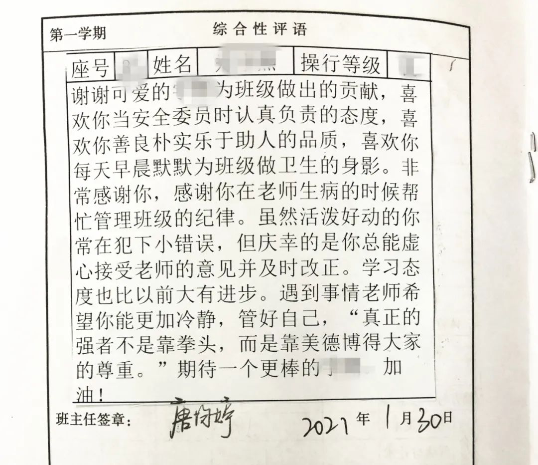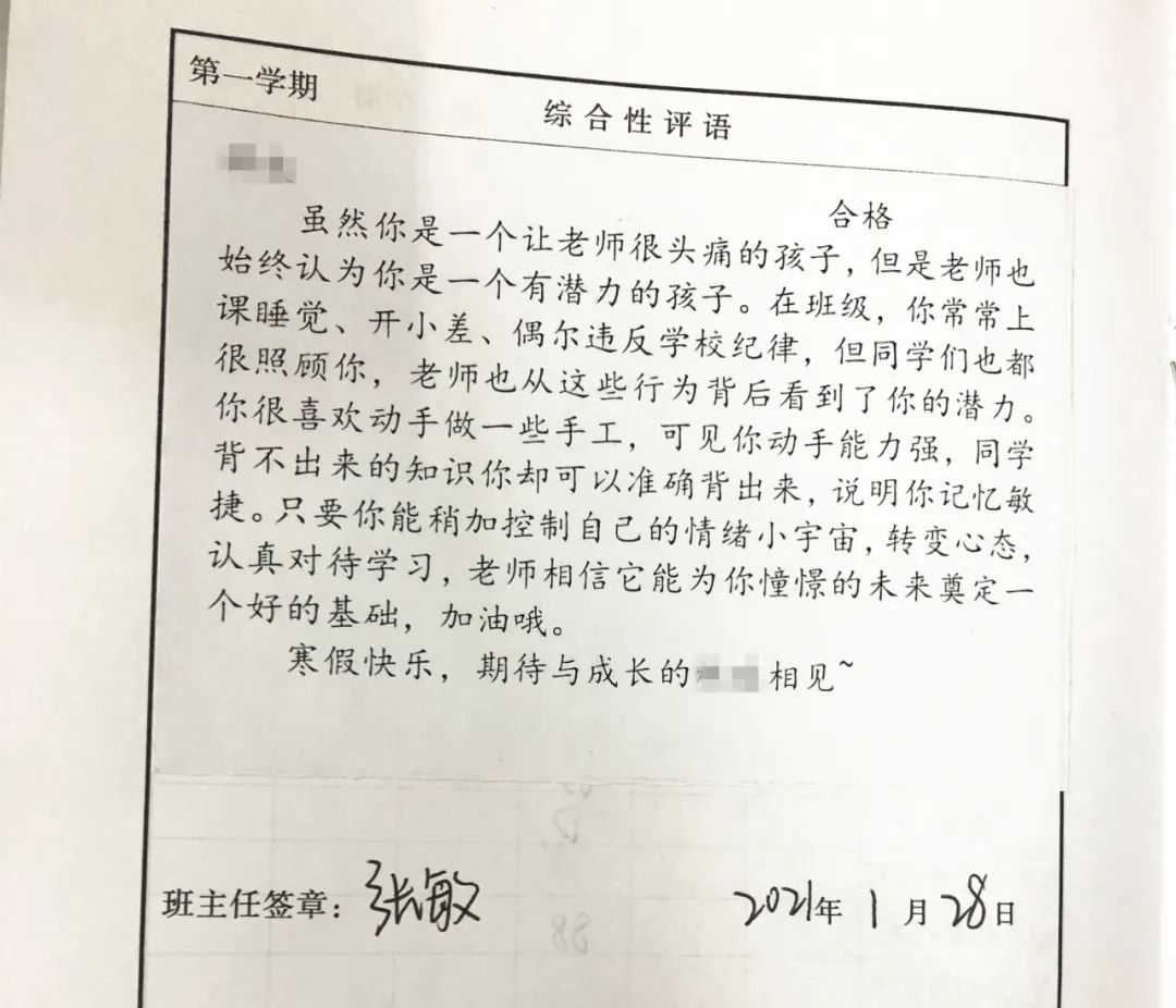 以上評語均來自學(xué)校的張敏老師,她說,自己還是學(xué)生的時(shí)候,收到期末評語總是特別興奮,期待看到老師對自己的評價(jià)。可大多數(shù)時(shí)候,老師的評語都是寥寥幾句套話。對此,她不免有些失望和難過。