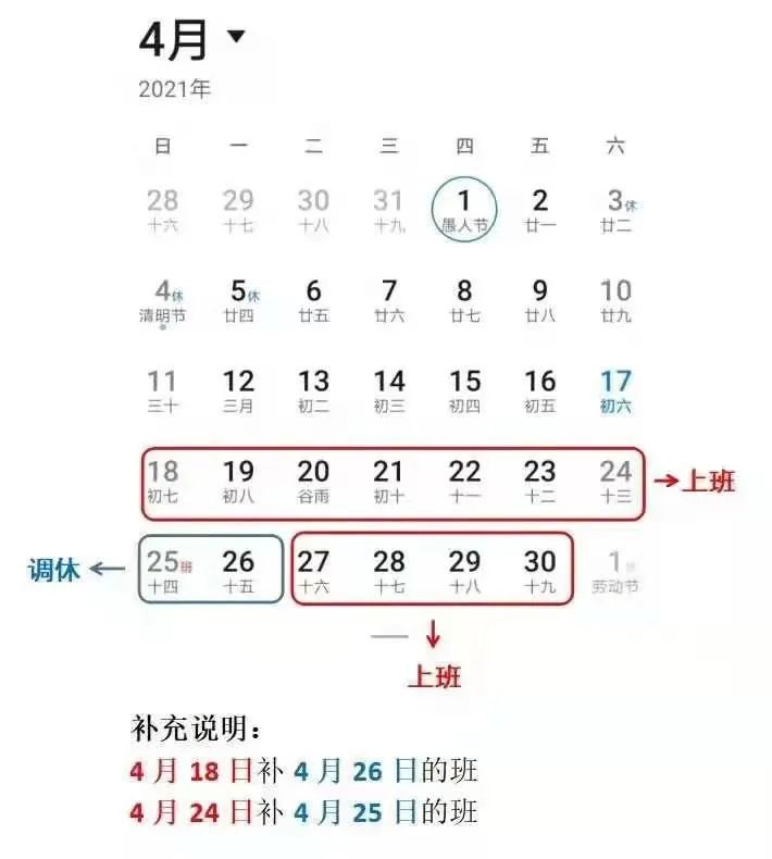 4月18日(星期日)、4月24日(星期六)調(diào)為工作日。