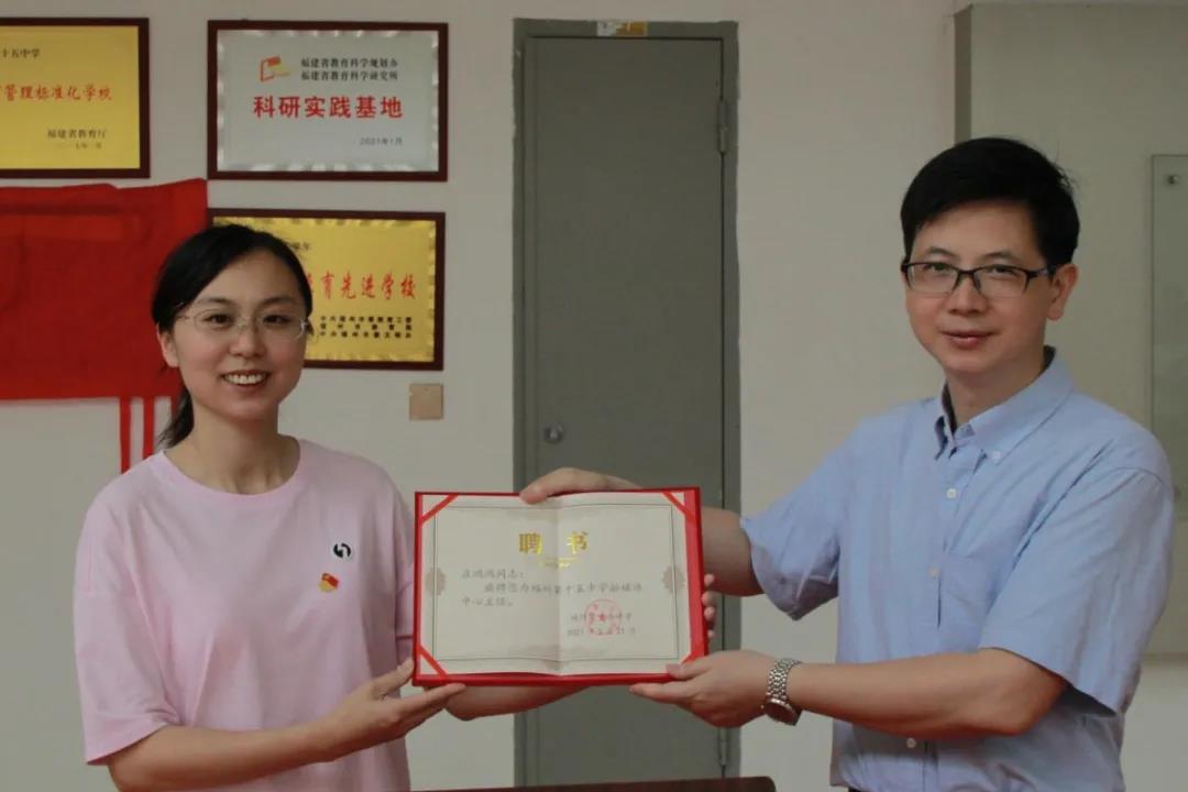 蔡隆校長給融媒體中心主任莊鴻鴻正式頒發(fā)聘書。