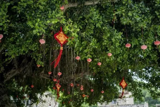村中心是座有著200多年歷史的石頭房,老屋房前,安靜佇立著一棵參天大榕樹,歷史的厚重與時光的斑駁交疊刻畫在枝干上,如歌似泣。樹上掛著一盞盞紅艷艷的小燈籠,遠遠望去,似是掛在樹上的祈福牌,默默為村民祈求幸福與安康。