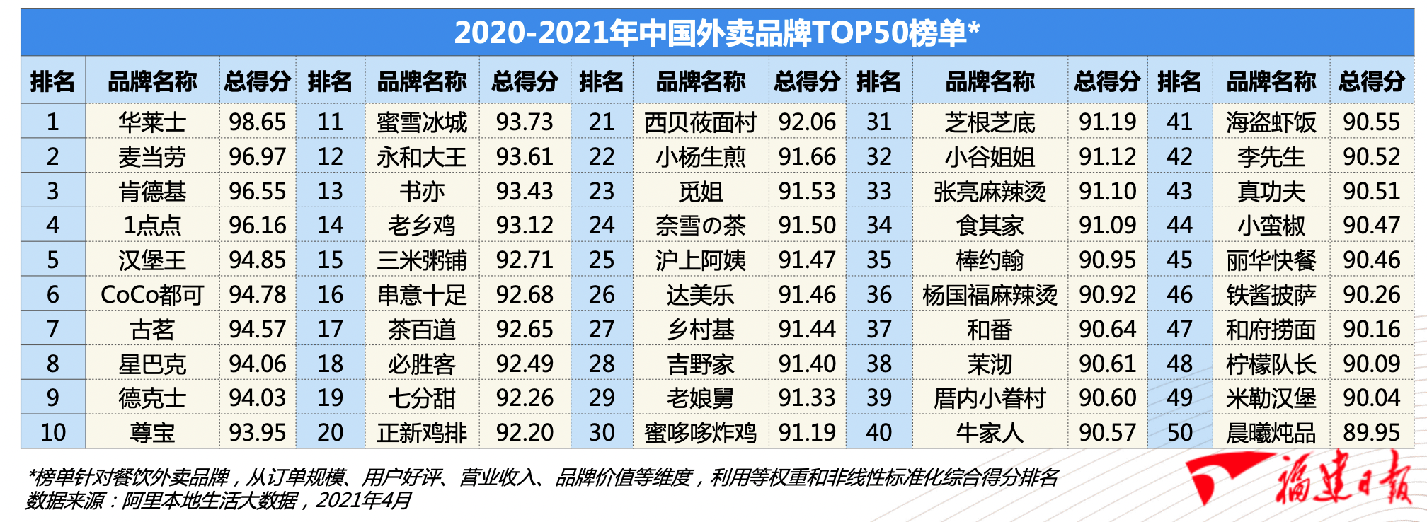 臺海網(wǎng)5月29日訊 據(jù)福建日報·新福建APP報道 近日,中國飯店協(xié)會聯(lián)合餓了么發(fā)布《2020-2021年中國外賣行業(yè)發(fā)展研究報告》,報告從訂單規(guī)模、用戶好評、營業(yè)收入、品牌價值等維度,利用等權(quán)重和非線性標(biāo)準(zhǔn)化綜合得分排名推出“2020—2021年外賣餐飲品牌TOP50”榜單。在這份榜單中,來自福州的快餐連鎖品牌華萊士力壓一眾國際連鎖企業(yè)和“網(wǎng)紅”品牌,位列榜單第一。數(shù)據(jù)顯示,目前華萊士在全國的門店數(shù)超過14000家。同樣來自福州的芝根芝底、塔斯汀漢堡也入圍榜單。