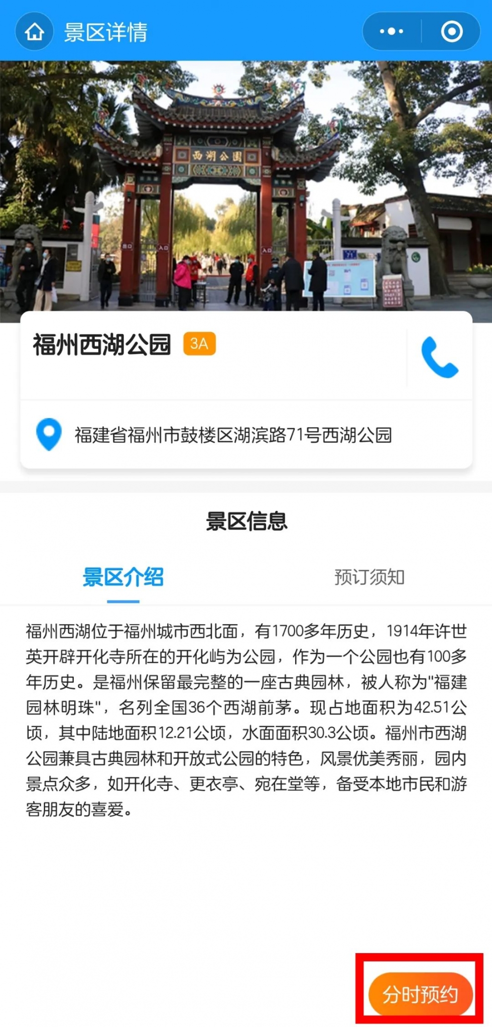 2.進(jìn)入西湖公園分時預(yù)約界面,點擊右下角分時預(yù)約。