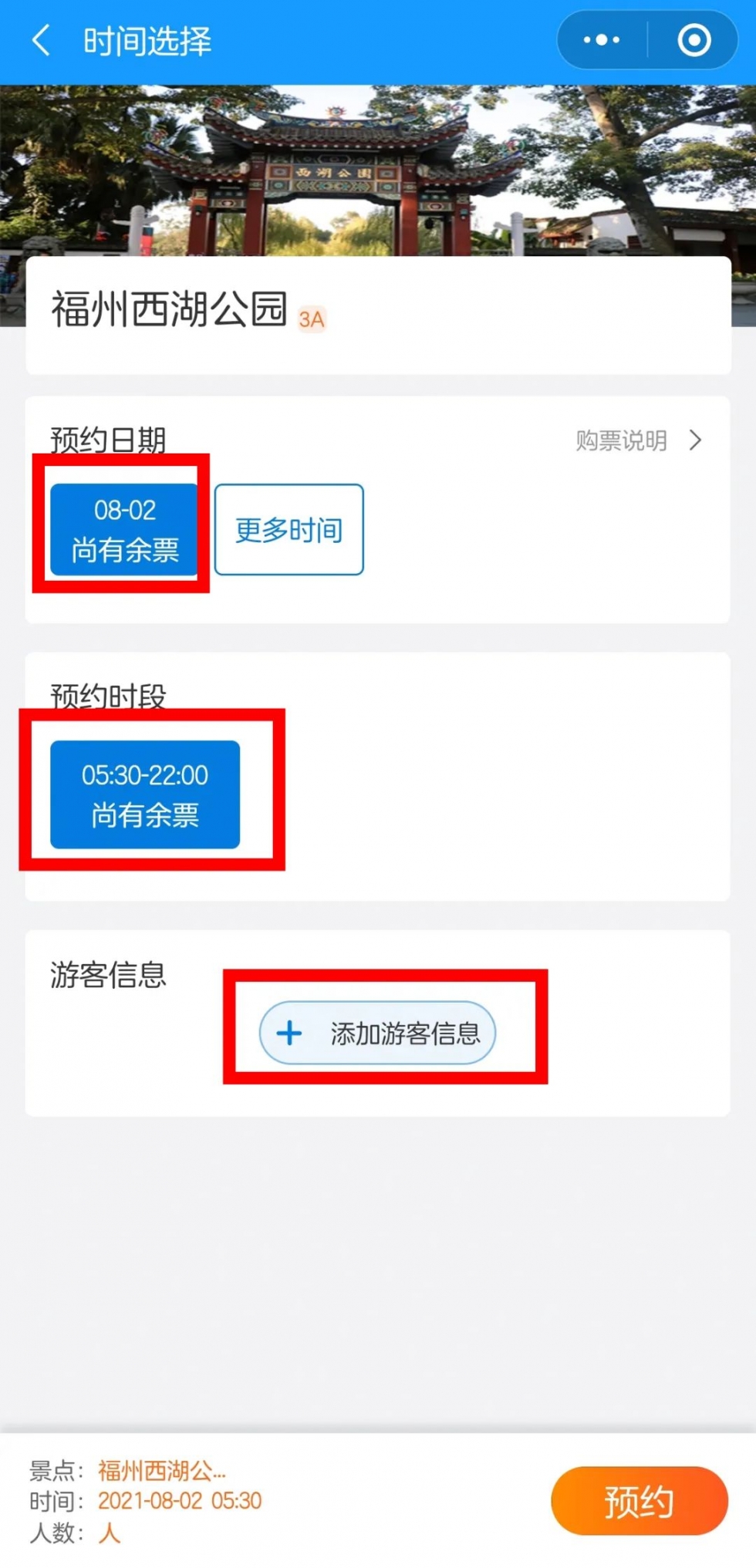 3.選擇預(yù)約日期、預(yù)約時段,添加游客信息后填寫正確的名字、身份證號和手機號,可為自己及多人同時進(jìn)行預(yù)約,可預(yù)約未來7日(含當(dāng)日)入園。