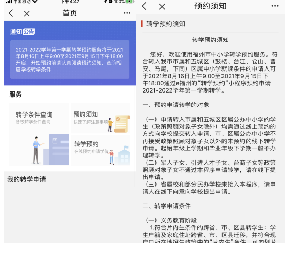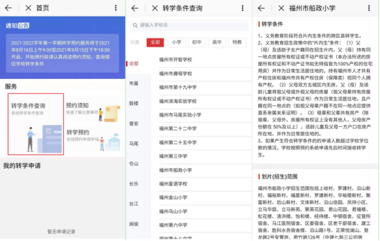 轉(zhuǎn)學(xué)預(yù)約服務(wù)是福州市教育局提供的線上轉(zhuǎn)學(xué)預(yù)審核預(yù)約應(yīng)用,旨在為福州市學(xué)生、家長提供便捷的轉(zhuǎn)學(xué)預(yù)約途徑,讓家長少跑路,提高辦事效率;學(xué)生、家長在線上預(yù)約成功后,由學(xué)?;蚪逃姓块T指定具體時間和地點線下辦理。該服務(wù)目前屬于試運行階段,主要功能有:(1)在線查看各學(xué)校的轉(zhuǎn)學(xué)條件和劃片(招生)范圍;(2)在線查看轉(zhuǎn)學(xué)預(yù)約服務(wù)須知;(3)在線申請轉(zhuǎn)學(xué)預(yù)約。