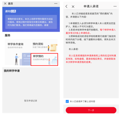 3.點擊首頁的“轉(zhuǎn)學(xué)預(yù)約”,閱讀“申請人承諾”并勾選“已閱讀”選項,點擊下一步。