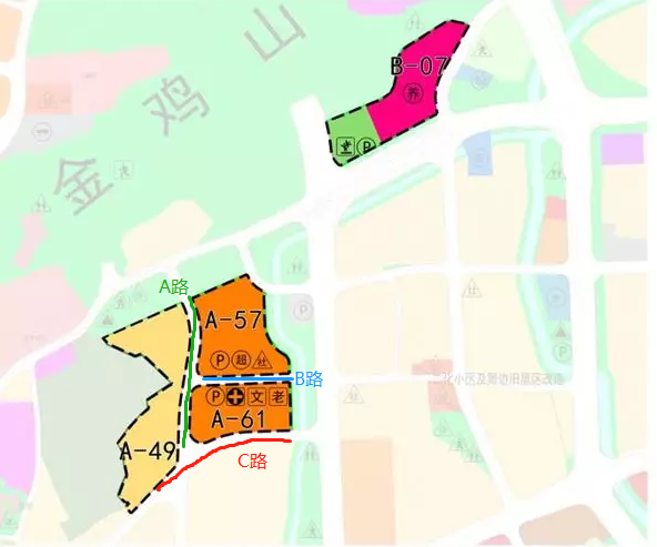 ?A路起于C路,道路為南北走向,沿線與B路相交,止于金雞山路,全長(zhǎng)約392米,規(guī)劃寬度20米;