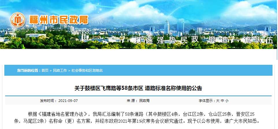 日前,福州市民政局發(fā)布58條市區(qū)道路標(biāo)準(zhǔn)名稱使用的公告(其中鼓樓區(qū)4條,臺(tái)江區(qū)2條,倉(cāng)山區(qū)25條,晉安區(qū)25條,馬尾區(qū)2條)。現(xiàn)予以公布使用,請(qǐng)廣大市民知悉。