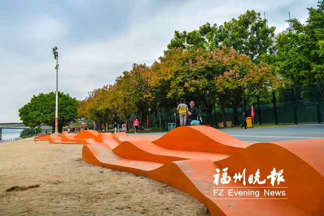 518舞臺附近景區(qū)常年舉行“6·6八閩放魚日”活動,老舊的透水磚園路改為灰色透水混凝土路,正紅色的陶粒加不銹鋼制成的魚鱗狀“波浪”閃閃發(fā)光,加上10多棵綠意盎然的櫸樹,這里變成全新的魚鱗廣場,成為看江賞景的好去處。