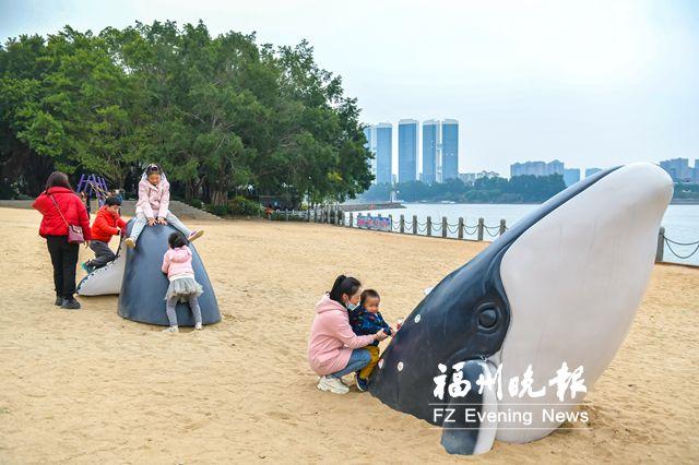 沿江來到金沙園,橙色的“波浪”和棒棒糖造型的燈柱吸睛。這里就是閩江公園北園網(wǎng)紅景點糖果沙灘。一條藍色“鯨魚”橫臥在沙灘上,還有秋千架、樹形爬網(wǎng)、海盜船、蹺蹺板、旋轉(zhuǎn)椅等糖果色的游樂設施,為沙灘注入活力。
