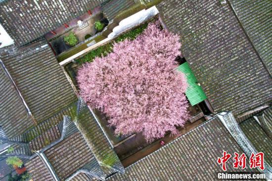 空中航拍古厝環(huán)繞的梅花樹。