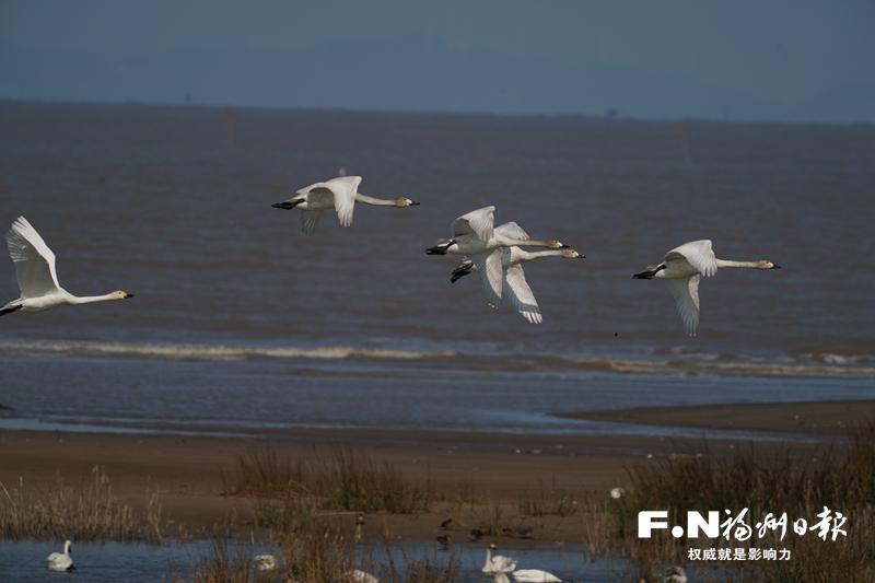 “小天鵝是候鳥(niǎo)北遷較早的一批,2月底開(kāi)始北飛,3月初集中遷離,陸續(xù)回到北方繁殖地。”鄭航告訴記者,2021年10月31日的清晨,他們第一次記錄到6只小天鵝來(lái)到閩江河口濕地鱔魚(yú)灘,包括2只天鵝父母和4只剛剛長(zhǎng)成的天鵝鳥(niǎo),以此拉開(kāi)小天鵝在閩江河口濕地越冬的序幕。“之后,小天鵝在11月初大批南遷而來(lái),于12月數(shù)量穩(wěn)定,保持450至550只,最高數(shù)量達(dá)到654只,成了濕地公園最美的一道風(fēng)景。”