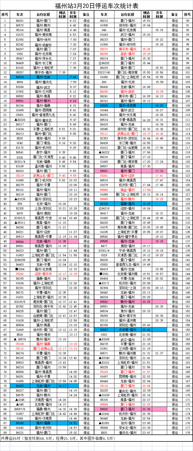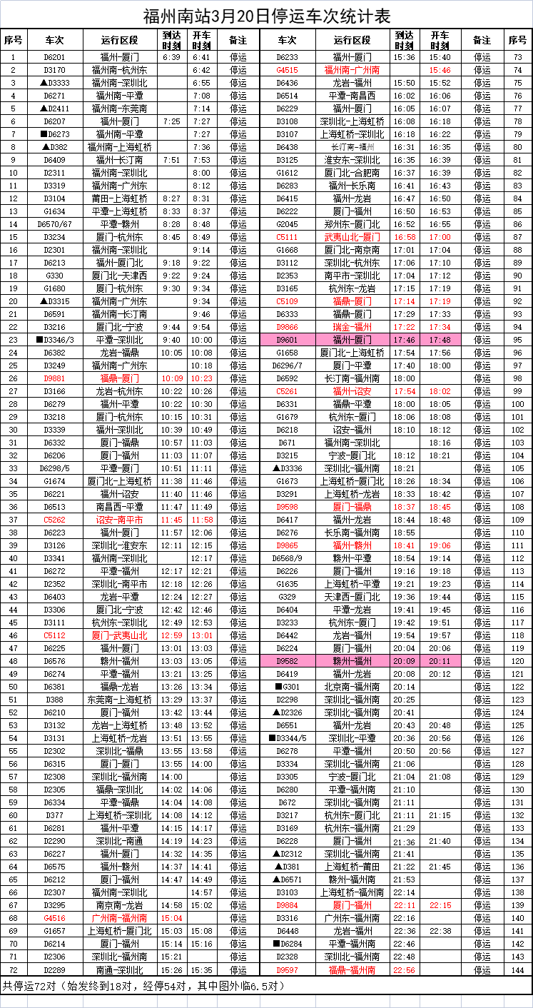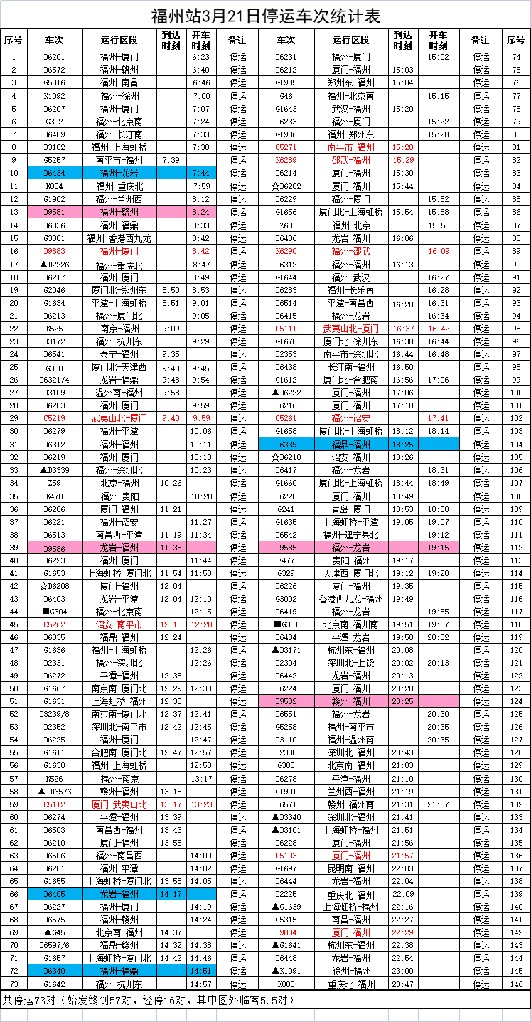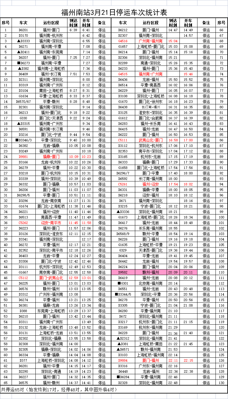 臺海網(wǎng)3月20日訊 據(jù)福建日報(bào)·新福建客戶端報(bào)道 20日,記者從福州火車站獲悉,受疫情影響,20、21日,福州北站、福州南站的部分車次停運(yùn)。具體如下:
