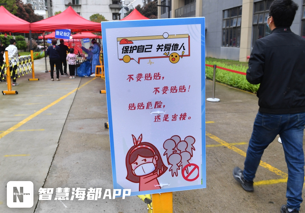 “紅管管,白簽簽,排隊一起做酸酸;做酸酸,不要錢,做完酸酸心里安。”27日上午,福州市鼓樓區(qū)洪山鎮(zhèn)大凰山社區(qū)的全員核酸檢測點,掛起了一張張?zhí)貏e的宣傳牌,除了朗朗上口的話語,還配上了卡通形象。排隊的居民陳先生告訴記者,“這些宣傳牌十分生動有愛且有趣,讓枯燥的排隊增添了許多快活的氛圍”。