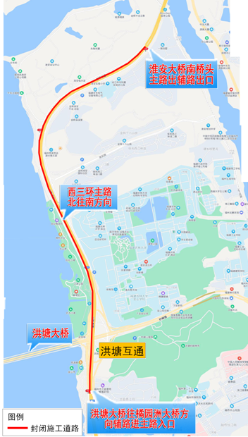 二、2022年4月15日凌晨0時至6時,對西三環(huán)路主路北往南方向(淮安大橋南橋頭至洪塘互通)實施臨時交通管制,禁止一切車輛通行。