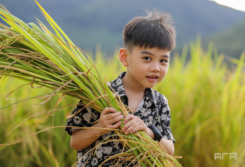 小孩子正在割稻谷(央廣網(wǎng)發(fā) 謝貴明 攝)
