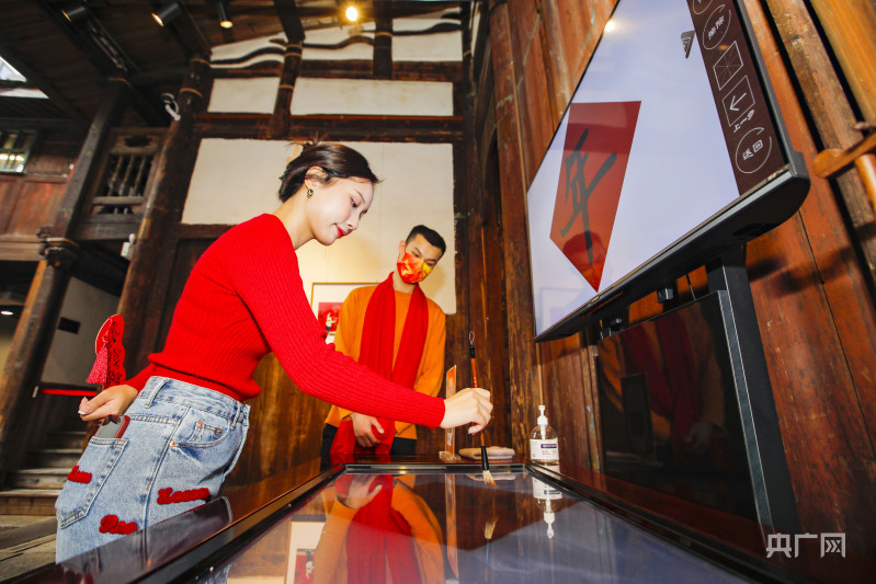 福州美術(shù)館里,市民正在體驗線上書寫“年”字(央廣網(wǎng)發(fā) 謝貴明 攝)