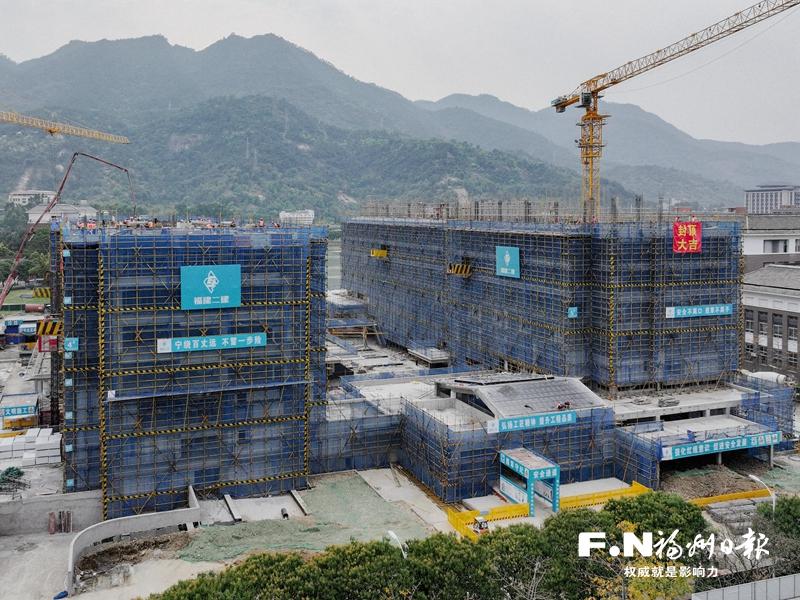 綠網(wǎng)外,施工電梯上上下下,塔吊伸長“手臂”來回吊裝;綠網(wǎng)內(nèi),鋼筋水泥撐起一片片忙碌有序的作業(yè)空間。“封頂后我們就立刻開始砌體施工,現(xiàn)在每天都有近300名施工管理人員在現(xiàn)場忙碌。”新樓內(nèi),福建二建集團(tuán)該項目管理人員陳卓銘帶著記者在各施工點“打卡”。