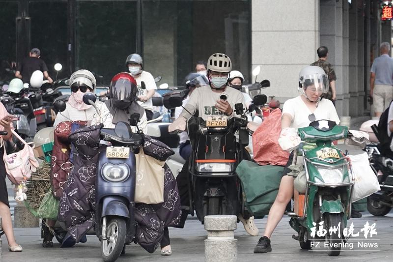 13日的福州街頭,市民“全副武裝”躲避太陽暴曬。