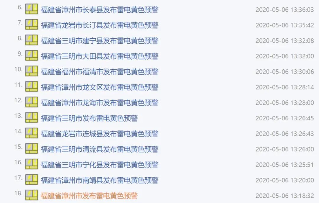 預(yù)計未來6小時內(nèi),漳州市的部分鄉(xiāng)鎮(zhèn)有雷電活動,局部伴有6-8級雷雨大風(fēng)、短時強降水等強對流天氣。請注意防范。