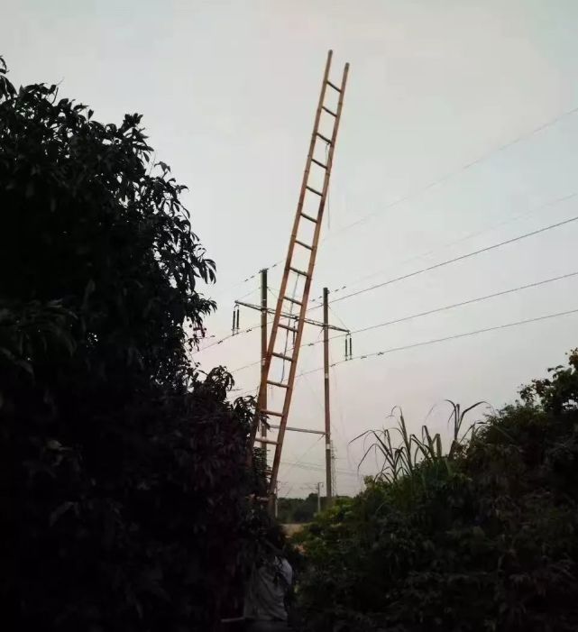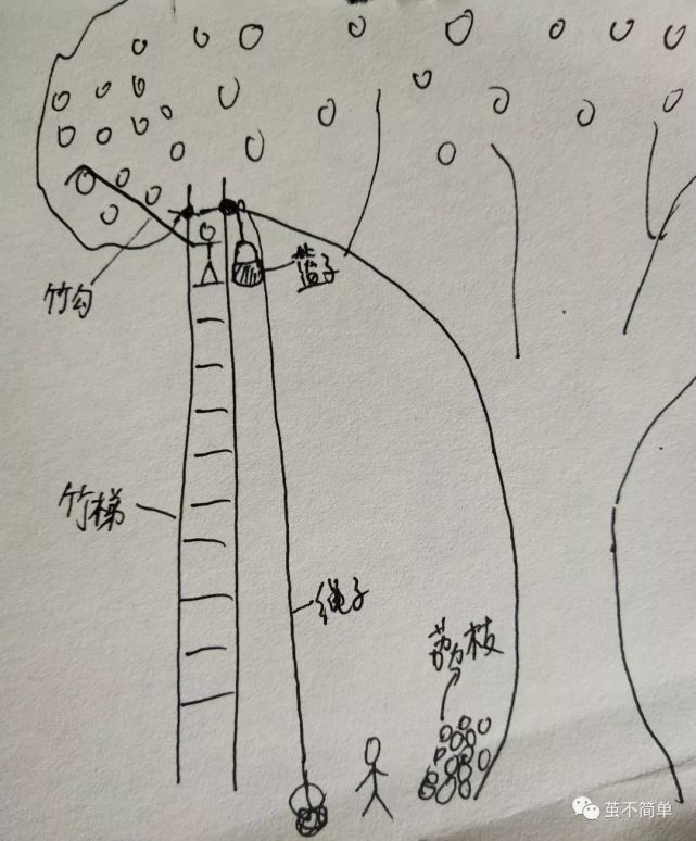 摘荔枝用的是豎竹梯,長長的,搭在樹尾的樹枝上,一人扶著,一人爬上去用繩子把梯子固定在樹枝上,摘完一個區(qū)域再換個位置。人站在竹梯上端,用竹勾把目標(biāo)拉過來,摘下放到掛在樹枝上帶繩子的籃子里,滿了再把籃子垂下來,下面有人接著,倒空,上面的人再把空籃子拉上去,如此反復(fù)。