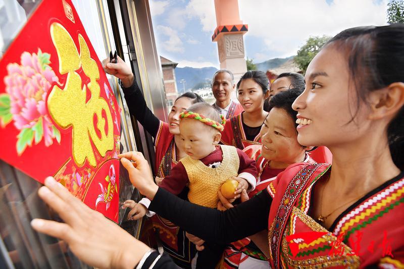 去年春節(jié),送坑村高山族村民貼春聯(lián)、掛燈籠、送福字歡歡喜喜迎新年。(福建日報(bào)記者 林輝/攝)