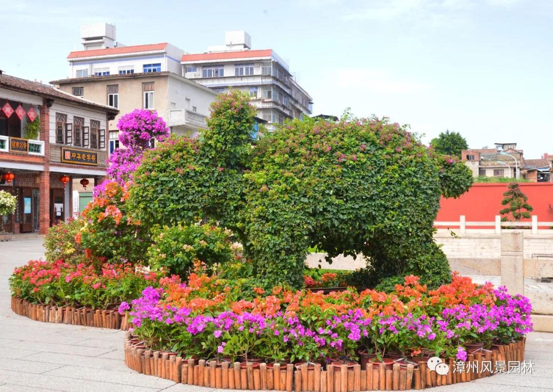 多層次且輔以“彩帶”造形的三角梅造景,營造出熱鬧喜慶、廣迎賓客的氛圍。