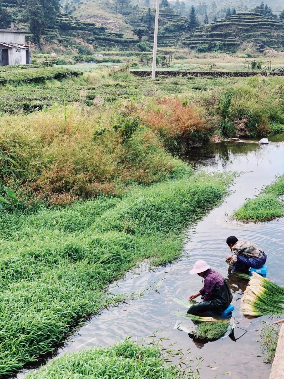 進入村莊,道路僅容一輛車通過,到達茶山需要穿越田間地頭。道路兩邊長滿蘆葦,與村莊的菜田形成天然的阻隔。滿眼望去都是一片安寧祥和的景象——農(nóng)婦在小溪邊洗菜,農(nóng)夫在田間勞作,孩童追逐嬉鬧,沒有多余的喧囂,只有天然純凈的聲音。