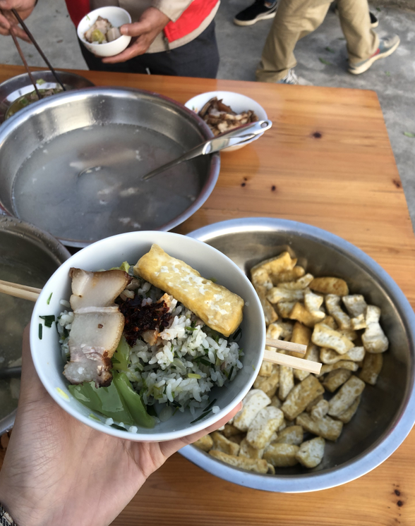 每逢飯點的時候,茶廠的阿姨們備好“山飯”——管夠的瘦肉香蔥燜飯、大鍋燉湯、還有幾個下飯菜,制茶師傅和附近鄰居就聚到一起,有在桌上吃的,有盛菜站著蹲吃的,熱熱鬧鬧,邊吃邊聊,飯后打個招呼又各自忙了。