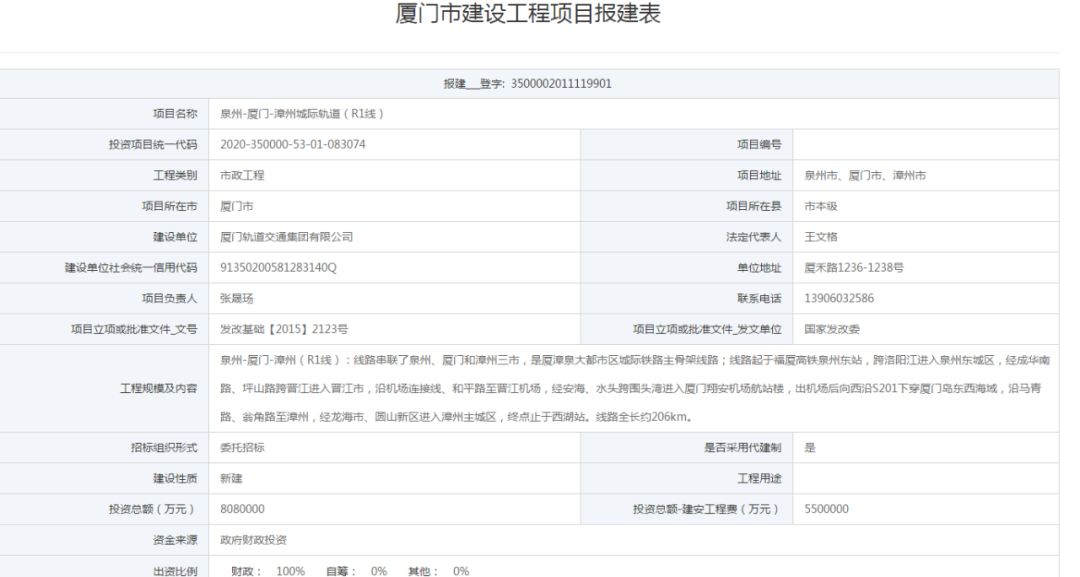 報(bào)建信息顯示:線路起于福廈高鐵泉州東站,跨洛陽江進(jìn)入泉州東城區(qū),經(jīng)成華南路、坪山路跨晉江進(jìn)入晉江市,沿機(jī)場連接線、和平路至?xí)x江機(jī)場,經(jīng)安海、水頭跨圍頭灣進(jìn)入廈門翔安機(jī)場航站樓,出機(jī)場后向西沿S201下穿廈門島東西海域,沿馬青路、翁角路至漳州,經(jīng)龍海市、圓山新區(qū)進(jìn)入漳州主城區(qū),終點(diǎn)止于西湖站。線路全長約206km,總投資約808億元。