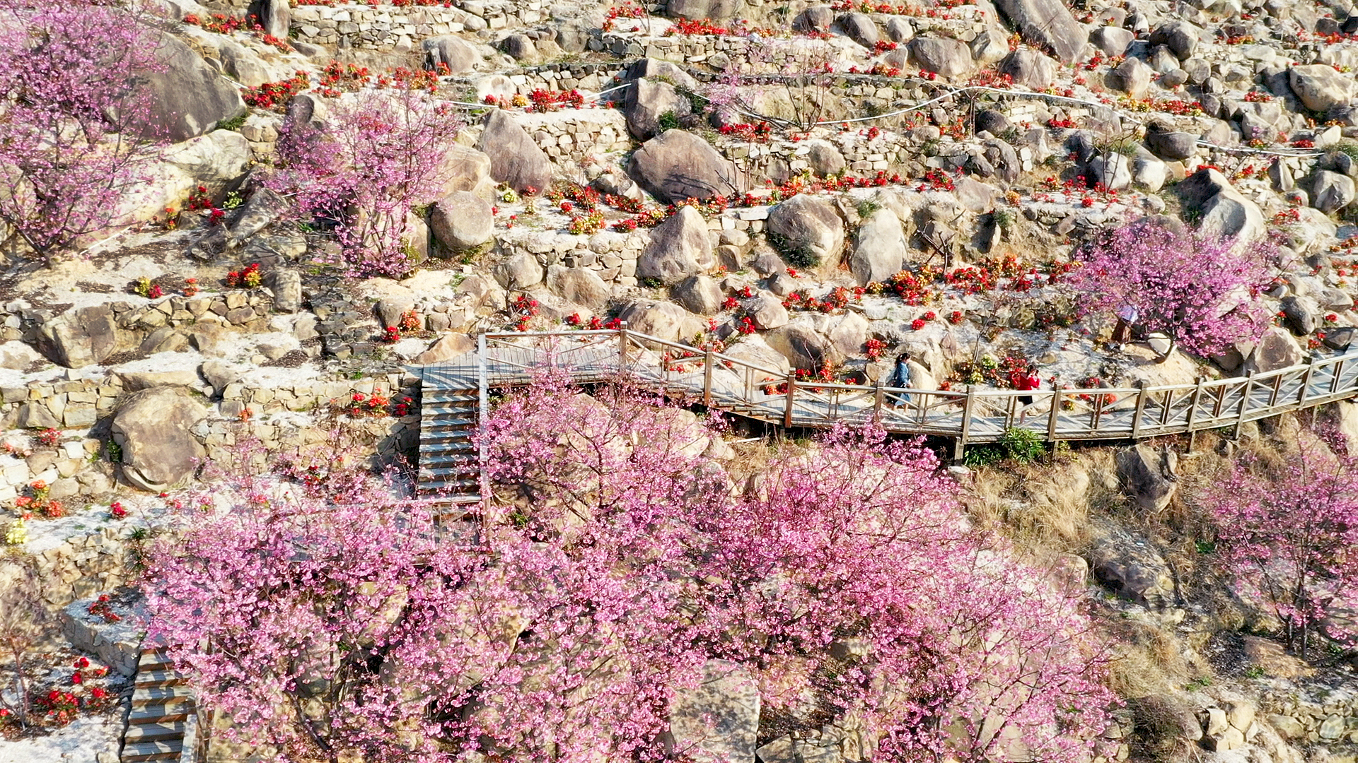 走進漳州港石巖植物園,閑庭漫步三五分鐘,就能看到一大片櫻花林,粉色的落櫻與木棧道相映成趣,盛放著一整個春天的爛漫天真。在這暖春的陽光里,站在櫻花樹下抬頭望去,擁簇開放的櫻花鋪滿了整個天空,時不時還能看到一些拇指大小的蜂鳥在花間穿梭,令人目不暇接,為這春日增添了一抹生動的氣息。