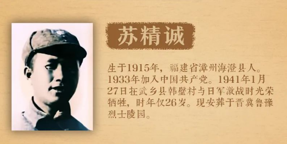 蘇精誠是八路軍在抗戰(zhàn)中犧牲的12位較著名的高級將領(lǐng)之一,是國家民政部公布的第一批著名抗日英烈,與龍海籍的李林、高捷成3人一起于2014年9月入選全國首批“300名著名抗日英烈和英雄群體名錄”。