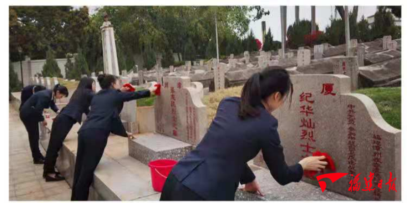 在漳州市烈士陵園,市烈士紀(jì)念設(shè)施保護(hù)中心工作人員集中向紀(jì)念碑鞠躬行禮、敬獻(xiàn)花藍(lán);市環(huán)衛(wèi)中心、中國(guó)光大銀行漳州分行部分黨員組成“代祭掃”黨員服務(wù)隊(duì),配戴黨員徽章為每處烈士墓擦拭墓碑,描摹碑文,為烈士提供一個(gè)干凈舒適的環(huán)境,也讓烈屬們安心、放心。