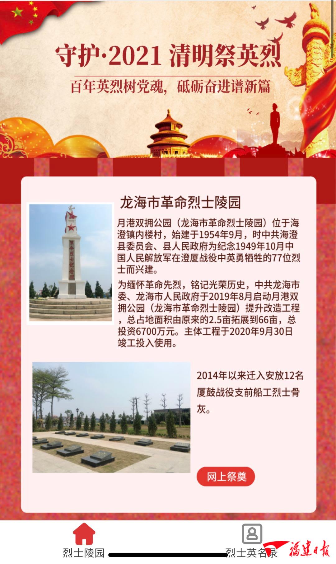 在龍海市退役軍人局,龍海團(tuán)市委、龍海市融媒體中心同退役軍人局共同推出 “守護(hù)•2021清明祭英烈”云祭掃活動(dòng)。4月2日至4月20日,民眾可通過(guò)微信客戶端,點(diǎn)擊選擇龍海市革命烈士陵園等烈士紀(jì)念設(shè)施或烈士英名錄,進(jìn)行獻(xiàn)鮮花、點(diǎn)蠟、贈(zèng)花圈、留言等緬懷活動(dòng)。