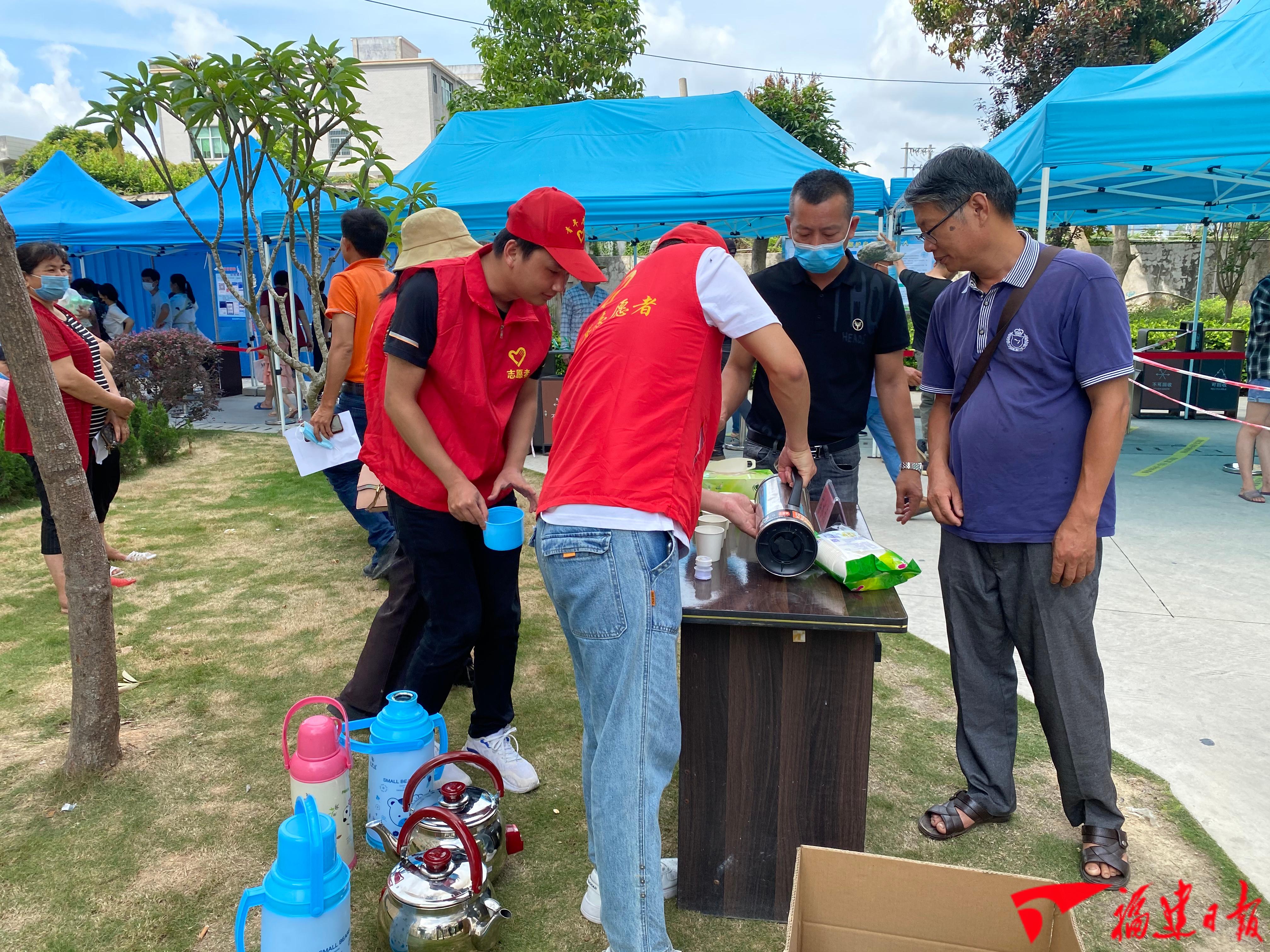 近日,筆者走進(jìn)四都鎮(zhèn)衛(wèi)生院疫苗接種點(diǎn)看到,原本露天的行道上搭建起了遮陽棚,設(shè)有茶水點(diǎn),群眾有序排隊(duì)等候,志愿者們?yōu)槿罕娺f上茶水,并幫助群眾解答疫苗接種流程中的疑惑。